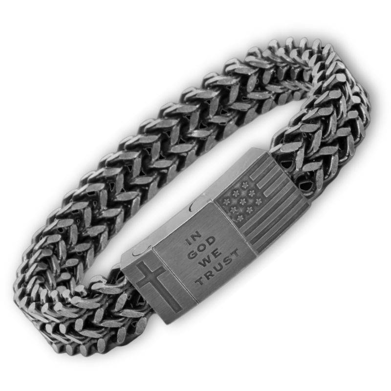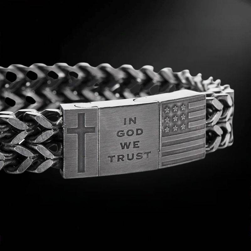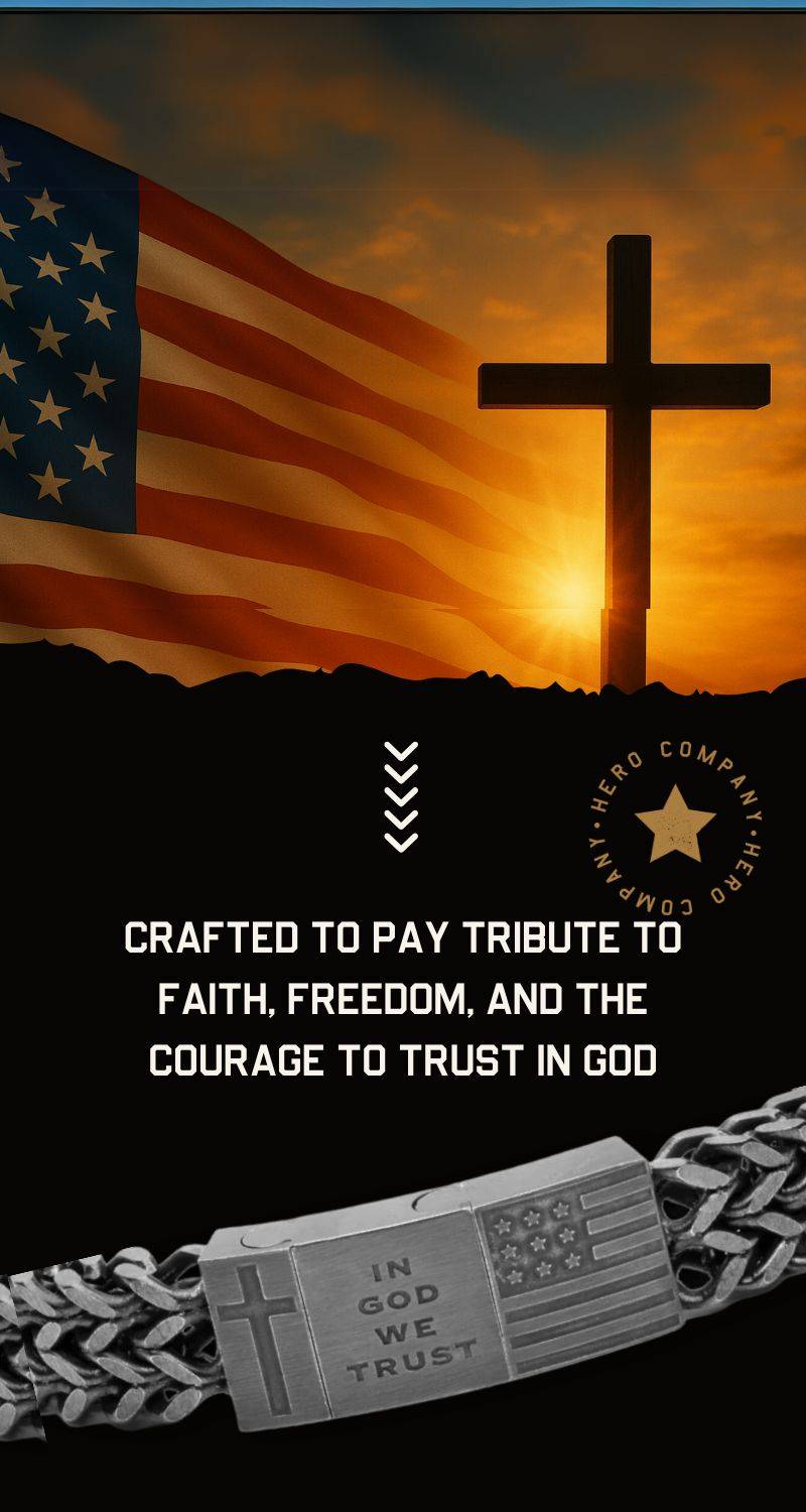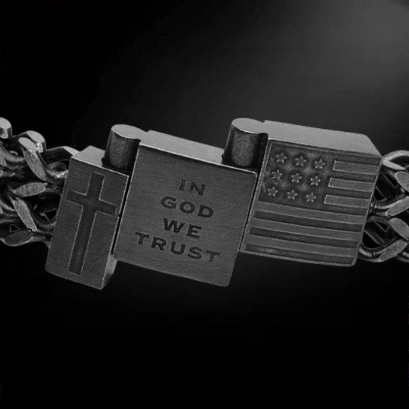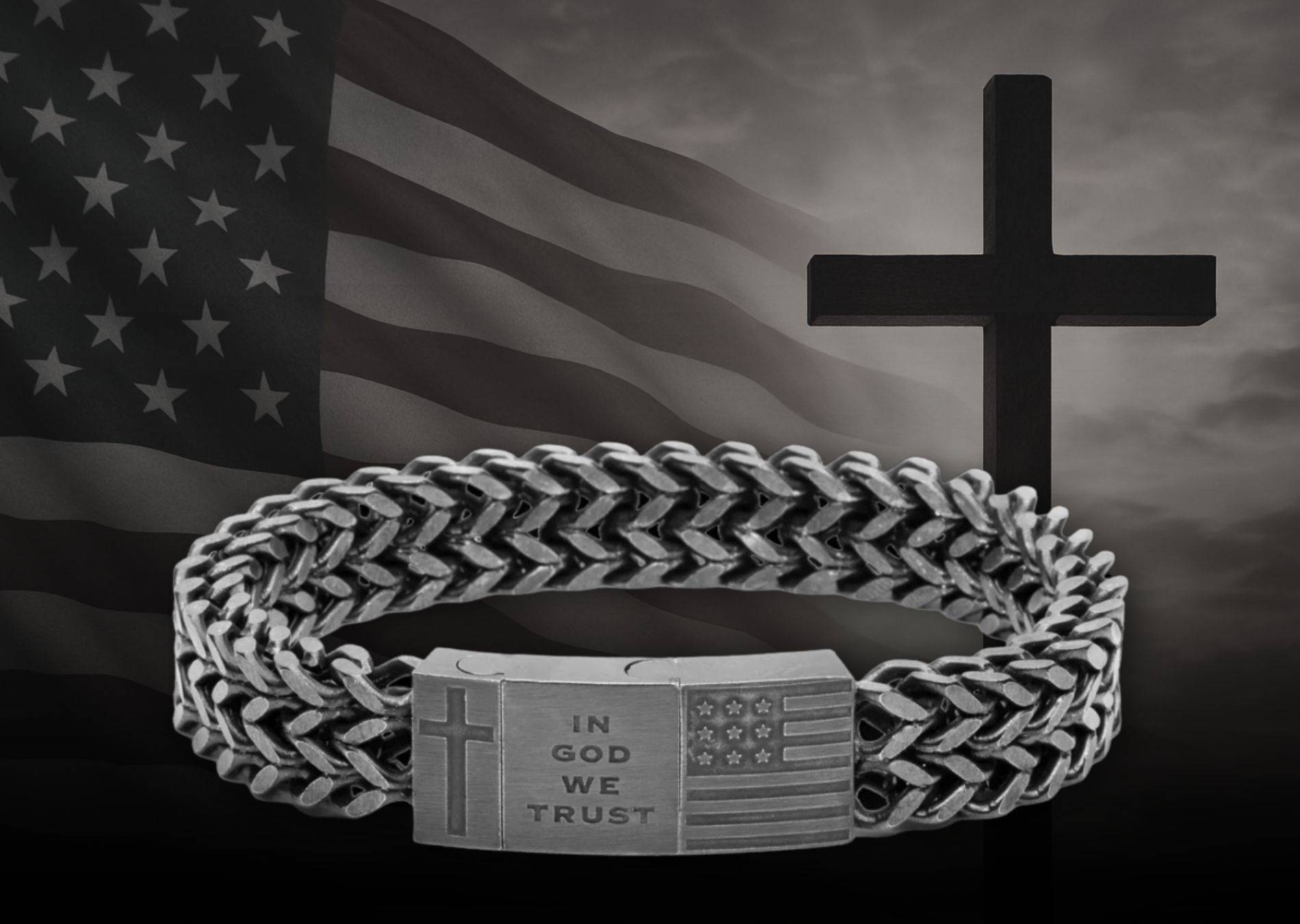 Engraved with "In God We Trust" and adorned with the Cross and American flag, this bracelet keeps you anchored in faith and the spirit of One Nation Under God.