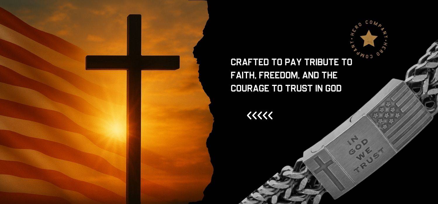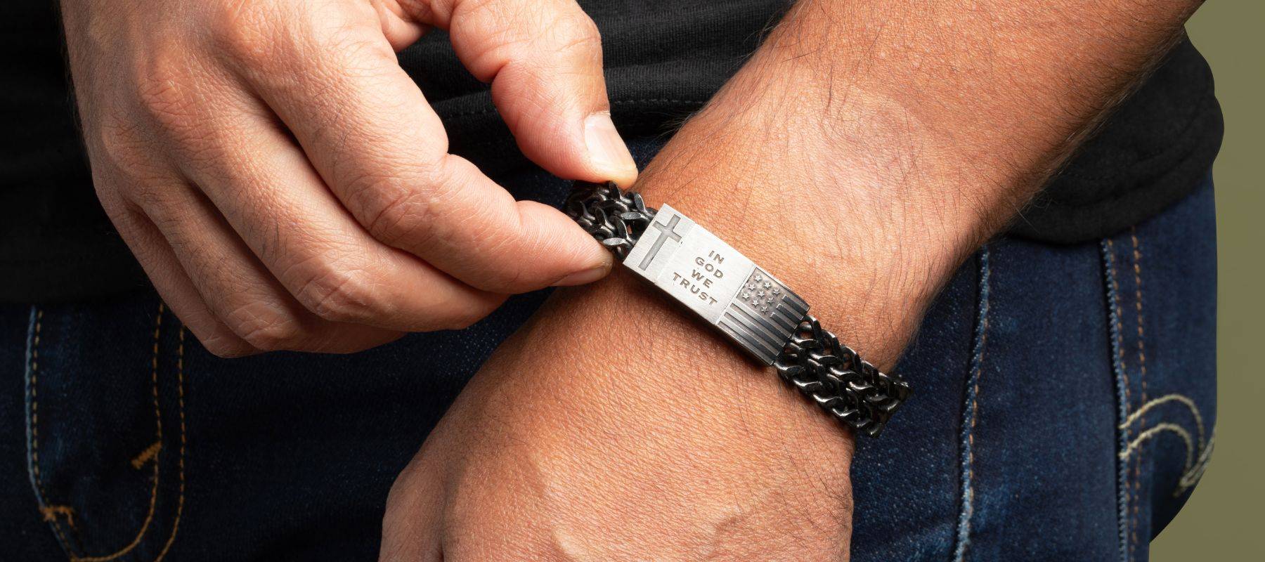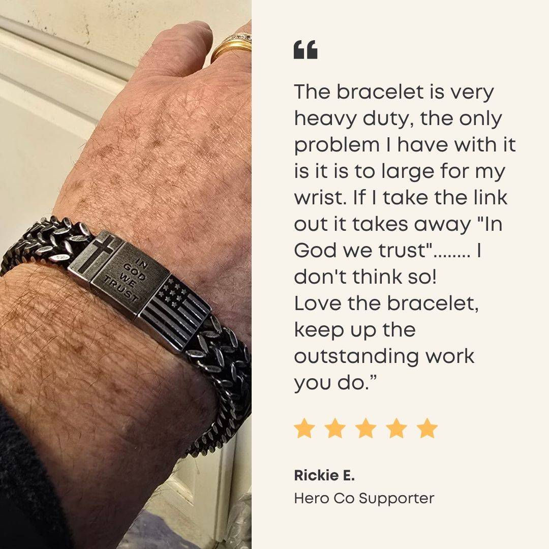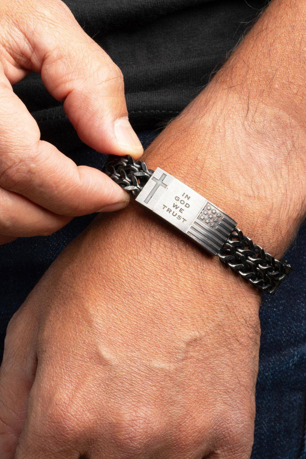 Engraved with "In God We Trust" and adorned with the Cross and American flag, this bracelet keeps you anchored in faith and the spirit of One Nation Under God.